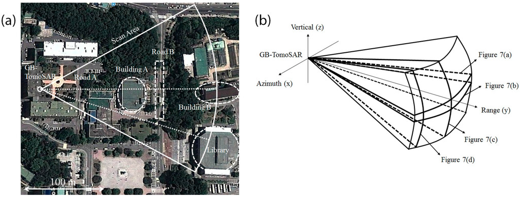 A GB-TomoSAR experiment was performed on the rooftop of a building at Kangwon National University. The picture of the experiment and the diagram of the GB-TomoSAR system are shown in Figure 1. Main targets are university buildings, roads and trees. Figure 5a shows the scan area of the TomoSAR experiment and Figure 5b illustrates three-dimensional conceptual diagram of TomoSAR dataset. The whole image scanning took about 8 h. According to the specification of GB-TomoSAR system given in Table 1, the range resolution (δR) is calculated to be 0.25 m, the azimuth angular resolution (δθ) is 0.65° and the vertical angular resolution (δϕ) is 0.87°.