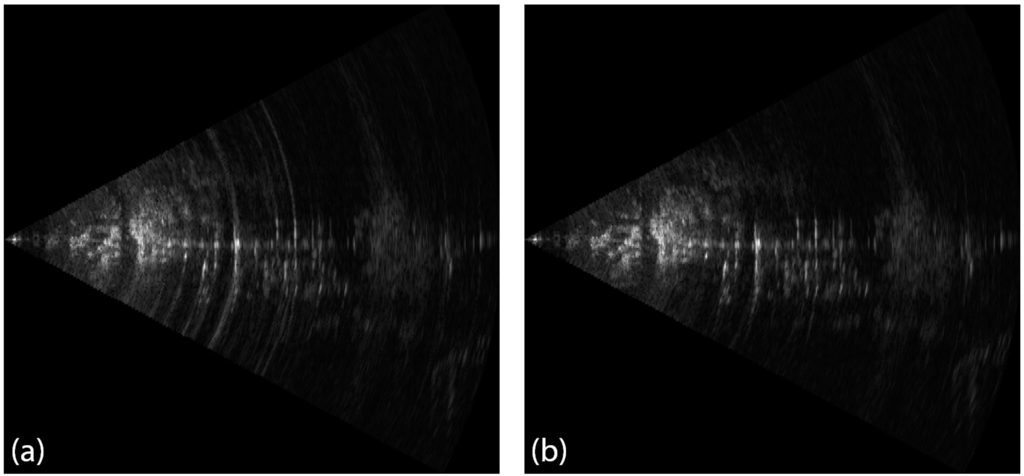 An example of range-azimuth image before vertical compression by using (a) time-domain algorithm and (b) deramp-FFT algorithm with Hanning filtering.