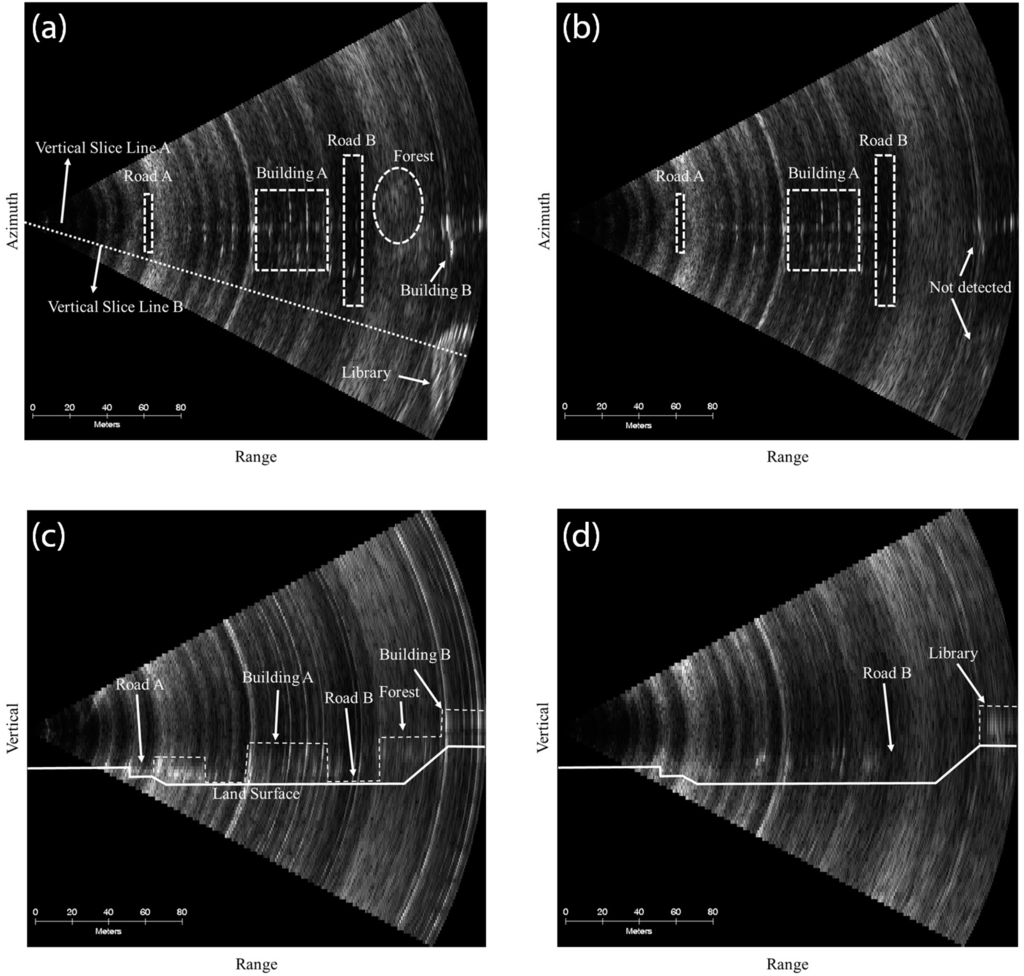 Figure 7a,b shows the range-azimuth slice image that includes the image center line and that on the plane slanted by 7.84° downwards from the image center line, respectively. All images were shown after the geometric and radiometric corrections. The library building and building B are clearly shown in Figure 7a but not detected in Figure 7b, which imaged below horizon in this range. From the distinctive features between Figure 7a,b, we could verify that the GB-TomoSAR was focused correctly. The two dotted lines in Figure 7a represent the vertical slice lines to obtain the range-vertical slice images shown in Figure 7c,d separated by an angle of 24.2°.