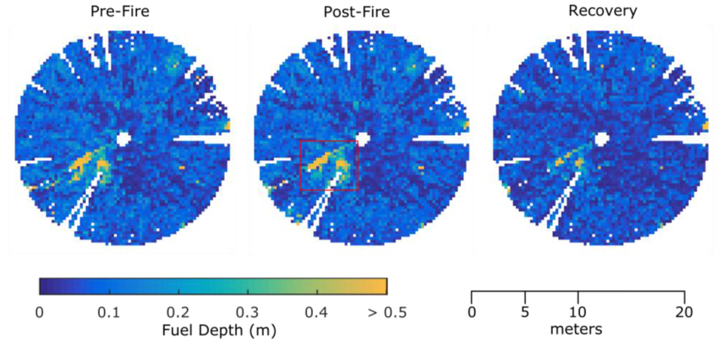 Pre-Fire, Post-Fire and Recovery Terrestrial Laser Scanning (TLS) measured fuel depth maps for Plot 1. The location of the fallen tree in this plot is indicated by the red box in the Post-Fire map.