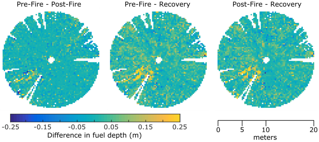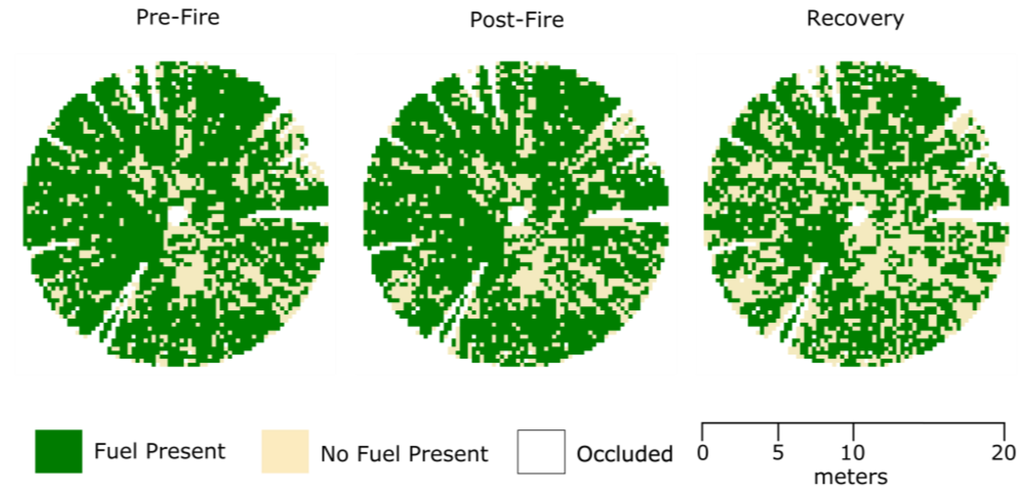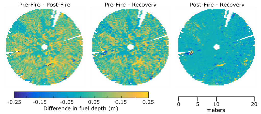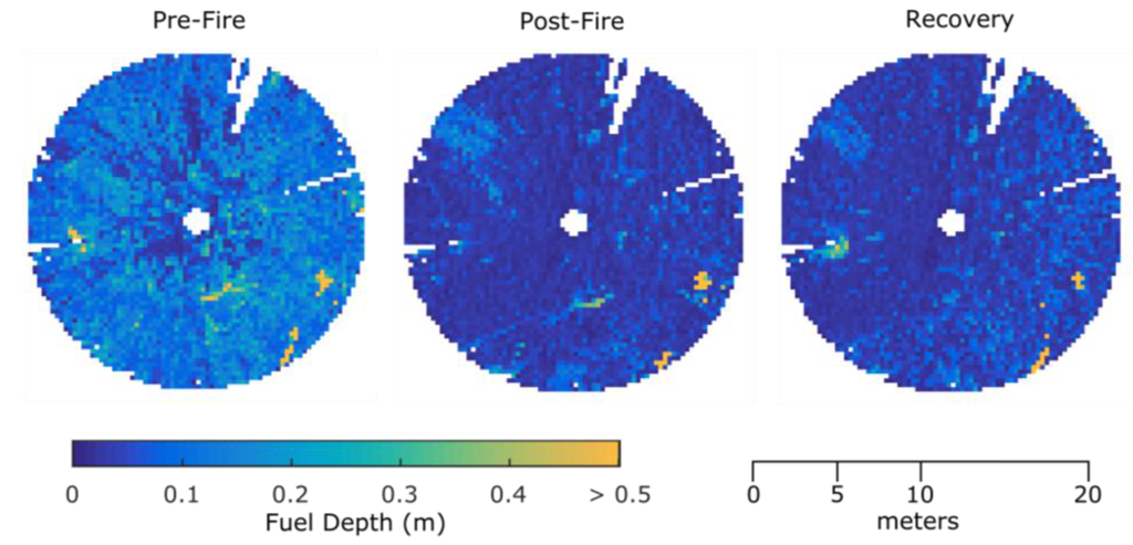 In contrast to the field estimates, the metrics derived from the TLS data did not distinguish between surface and near-surface fuels. Nevertheless, the estimates of fuel height appear to mostly agree. For instance, post-burn fuel height estimated at 0.13 m by TLS analysis was estimated to be 0.1 m to 0.2 m for both surface and near-surface vegetation, respectively.