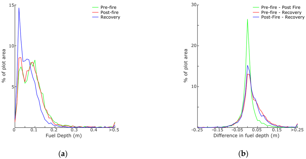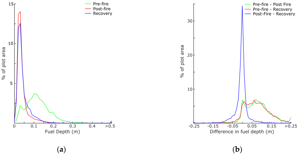 Distribution of (a) fuel depth and (b) differences in fuel depth shown for all three measurement stages for Plot 1.