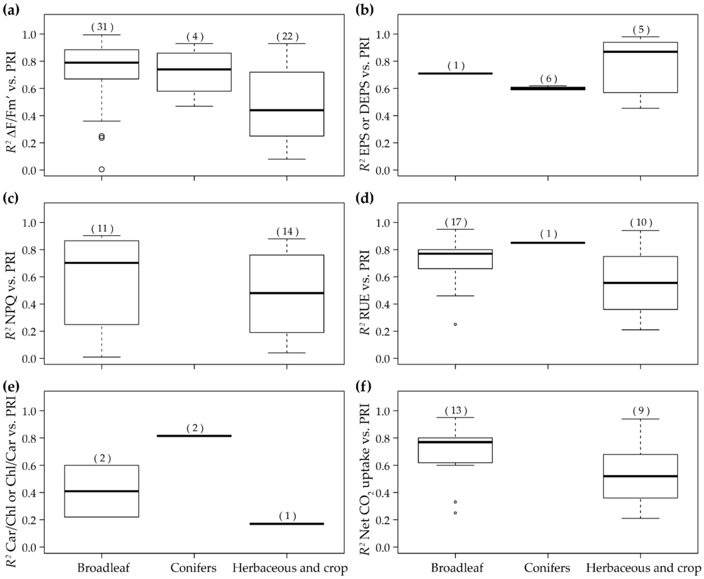 Boxplots of the coefficients of determination of the relationships between PRI and physiological variables at the foliar level and diurnal timescale: (a) Actual photochemical efficiency (ΔF/Fm’); (b) Epoxidation or de-epoxidation state of xanthophylls (EPS or DEPS); (c) Non-photochemical quenching (NPQ); (d) Radiation-use efficiency (RUE); (e) Carotenoid/chlorophyll (Car/Chl) or chlorophyll/carotenoid (Chl/Car) ratio; and (f) Net CO2 uptake. Central lines represent medians, boxes represent 50% of the data, whiskers represent minima and maxima and circles represent outliers. The numbers of correlations reported in the literature are shown in brackets.