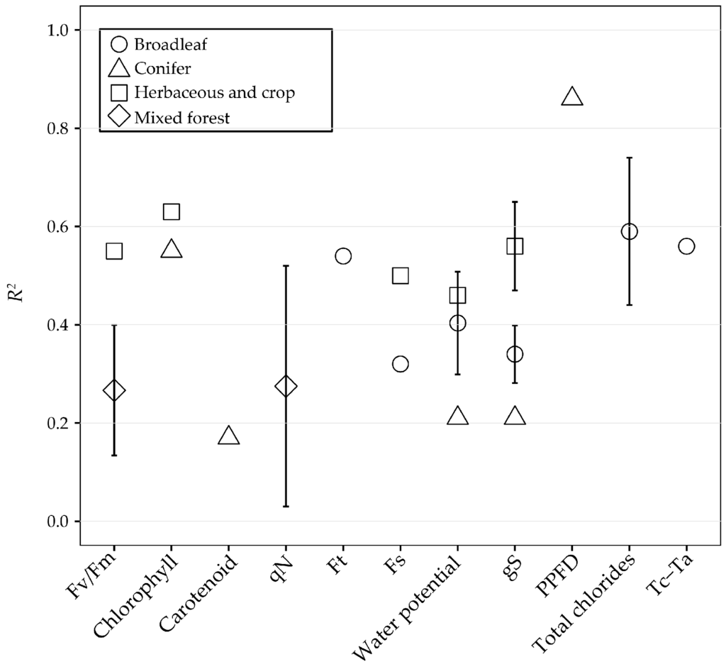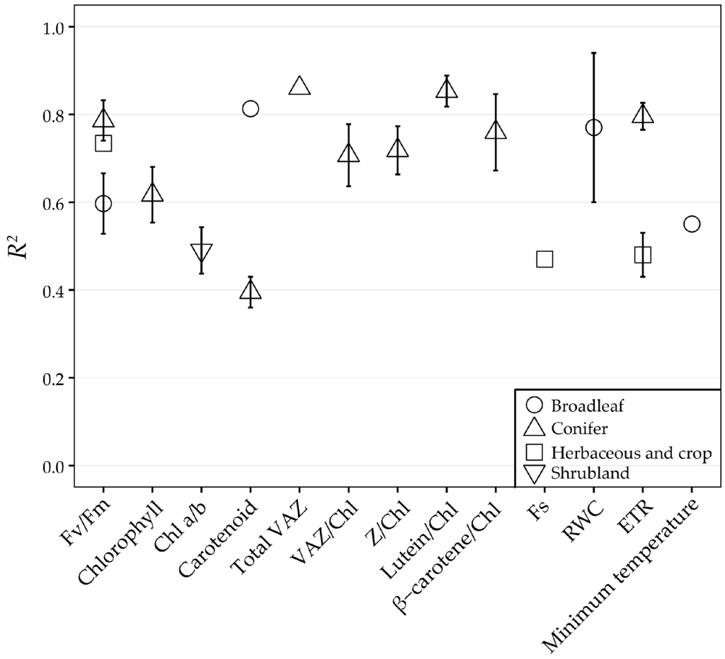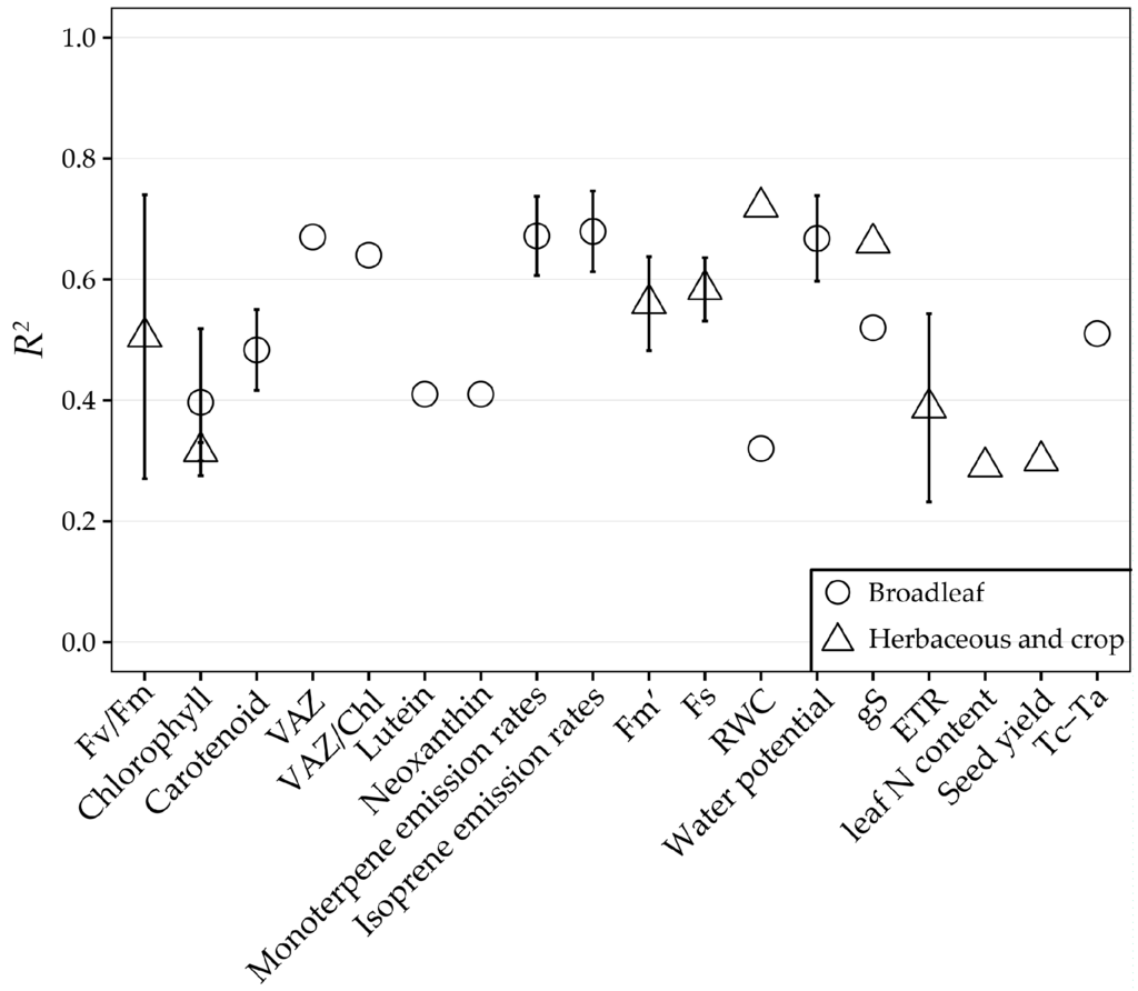 The R2 of PRI with other physiological variables is presented in Figure 2. All studies focused on broadleaved and herbaceous/crop plants, for which PRI explained averages of 68% or 67%, respectively, of the variation of emissions of volatile organic compounds (monoterpenes and isoprenes). PRI was significantly correlated with foliar nitrogen content and seed yield (R2 = 0.29, p < 0.0001 and R2 = 0.30, p < 0.0001, respectively) [115] for soybean leaves exposed to elevated ozone. PRI was also significantly correlated in six broadleaved species with water potential under water stress (0.60 < R2 < 0.95) [30] and with RWC (R2 = 0.32) under water and temperature stress [93].