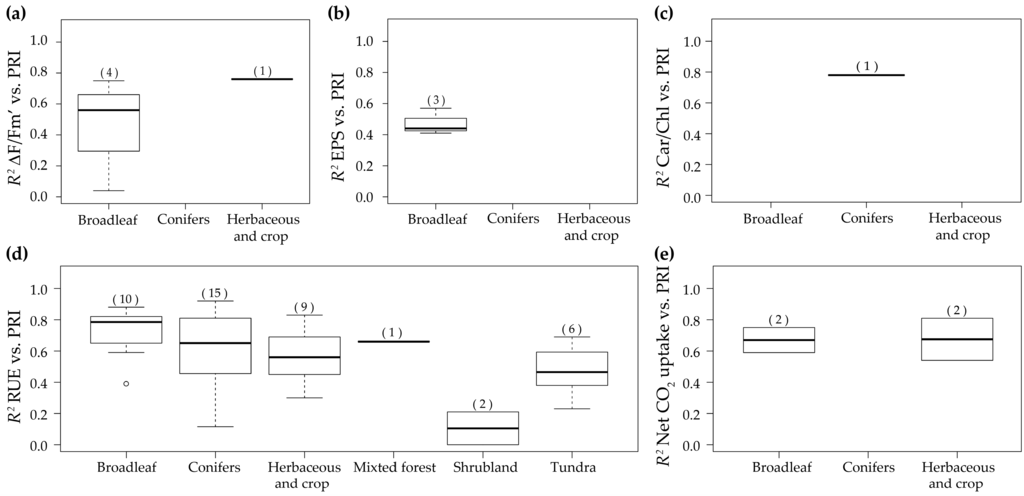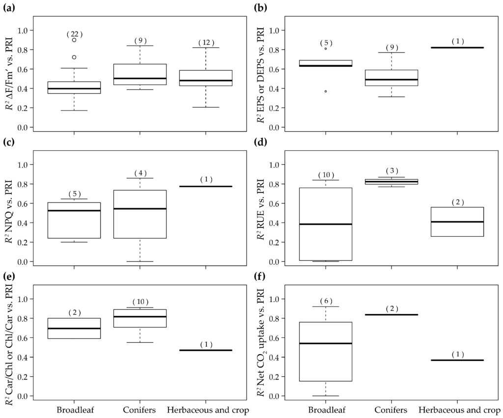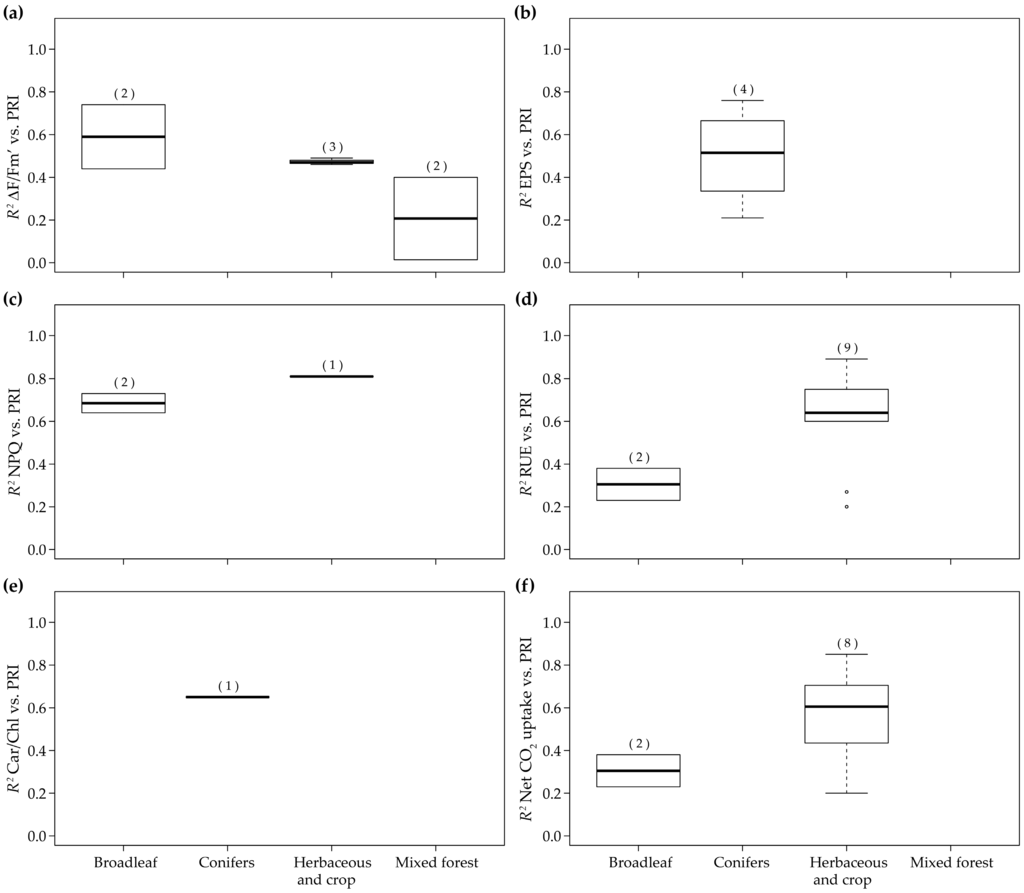Boxplots of the coefficients of determination of the relationships between PRI and the physiological variables at the canopy level and diurnal timescale: (a) Actual photochemical efficiency (ΔF/Fm’); (b) Epoxidation state of xanthophylls (EPS); (c) Non-photochemical quenching (NPQ); (d) Radiation-use efficiency (RUE); (e) Carotenoid/chlorophyll (Car/Chl); and (f) Net CO2 uptake. Central lines represent medians, boxes represent 50% of the data, whiskers represent minima and maxima and circles represent outliers. The numbers of correlations reported in the literature are shown in brackets.