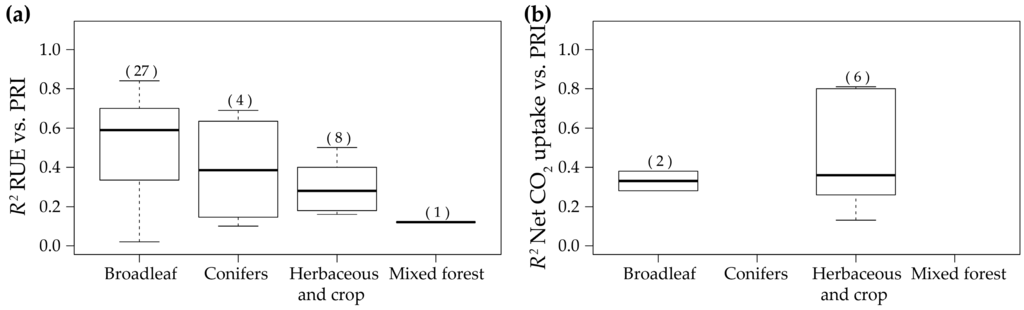 Boxplots of the coefficients of determination of the relationships between PRI and (a) Radiation-use efficiency (RUE) and (b) Net CO2 uptake at the ecosystemic level and seasonal timescale. Central lines represent medians, boxes represent 50% of the data and whiskers represent minima and maxima. The numbers of correlations reported in the literature are shown in brackets.