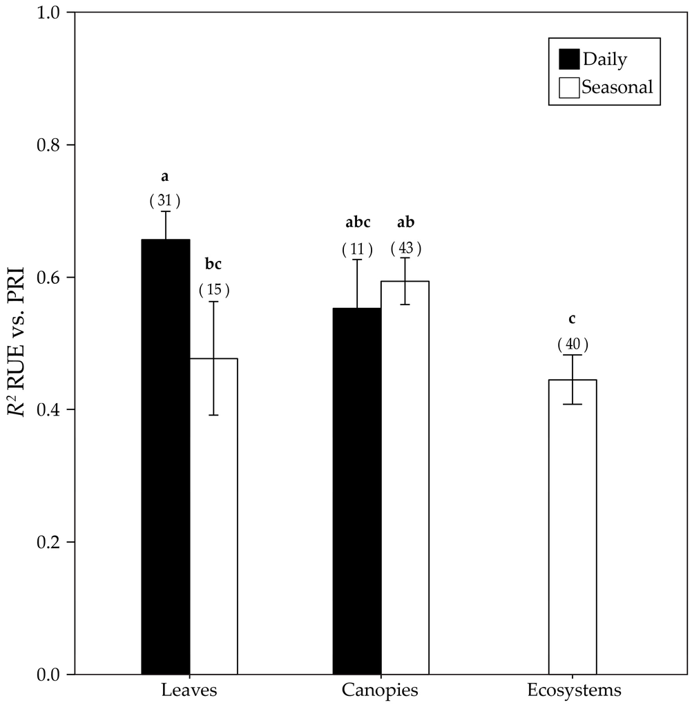 Comparison of the strength of the relationships between PRI and RUE across temporal and spatial scales. Each bar represents the average coefficient of determination for each source of temporal variation (daily or seasonal) and spatial scales (leaf, canopy and ecosystem). Different letters indicate significant differences (p < 0.05). Error bars represent the standard errors, and the numbers of reported correlations are shown in brackets.