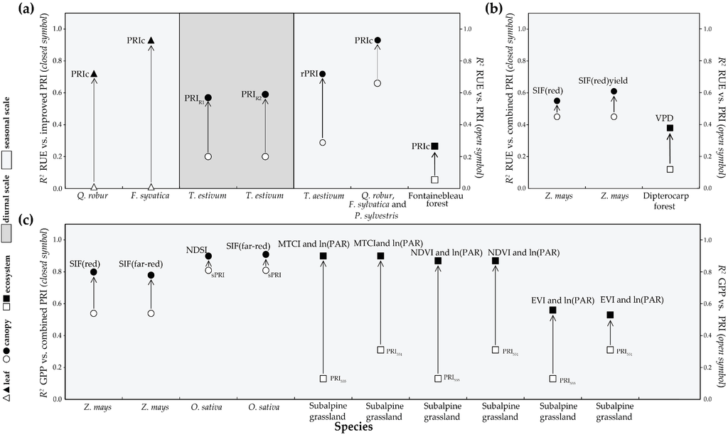 Comparison of the relationships between RUE/GPP vs. PRI and RUE/GPP vs. improved/combined PRI. (a) PRIc was used for Q. robur and F. sylvatica [86], a mixed canopy of Q. robur, F. sylvatica and P. sylvestris [107] and a deciduous broadleaved forest [123]; PRIR1 and PRIR2 were used for T. aestivum [109] and rPRI for T. aestivum (mixed non-linear model, rPRI = PRI − (0.15 × (1 − exp(−0.5 × LAI)) − 0.2)) [124]; (b) Tracking RUE combining PRI with SIF (red) or SIF (far-red) yield in Z. mays (RUE = a + b × PRI + c × SIF + d × PRI × SIF) [81] and with VPD in a dipterocarp forest (RUE = 0.153 × PRI − 0.00067 × VPD + 0.029) [77]; (c) Tracking GPP combining PRI with SIF (red) or SIF (far-red) in Z. mays (GPP = a + b × PRI + c × SIF + d × PRI × SIF) [81], with NDSI (GPP = (a0 × sPRI + a1) × (a2 × NDSI + a3) × PARi, sPRI = (1 + PRI)/2) and SIF (far-red, GPP = (a0 × sPRI + a1) × (a2 × SIF + a3), sPRI = (1 + PRI)/2) in O. sativa [129] and with VI (MTCI, NDVI and EVI) and ln(PAR) (GPP = (a0 × PRI + b0) × (a × VI + b) × ln(PAR)) [136] in a subalpine grassland.