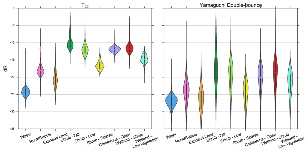 Overall, the classifications using the elements of the matrix provide better results than the polarimetric decompositions. While polarimetric decompositions are generally used to emphasize or better represent the scattering mechanisms found in natural environments, they are general models that may not apply to the specific classes used for this study. These findings are consistent with the conclusions from [43] where they considered that the coherency matrix is optimal for classification purposes using the SVM algorithm, as the addition of other polarimetric parameters did not provide significant improvements. The findings in [53] also show that combining all of the parameters from the various polarimetric decompositions adds little benefit to the overall accuracy of a classification using the random forest algorithm. The matrix contains the full polarimetric information enclosed within the signal, so it seems that even if the decompositions emphasize the main scattering mechanisms, the SVM scheme is able to better pick out small differences in the signal that characterizes the different classes. For example, the double-bounce scattering mechanism from the model-based decomposition shows little differentiation between classes compared to the element from the coherency matrix, which is generally associated with the double-bounce mechanism (Figure 4). The violin plots introduced in Figure 4 illustrate the distribution of the and values found within each class. Since SVM classifications do not assume any statistical distribution about the input data or the different classes, they are well suited for extracting the variations of the signal within the matrix characterizing each class. However, the classes with the lowest user’s and producer’s accuracies are the wetland-shrub, shrub-low, coniferous-open and shrub-tall, which have significant overlap in double-bounce scattering, as seen in Figure 4. These classes also display similar distributions for the element (Figure 5).