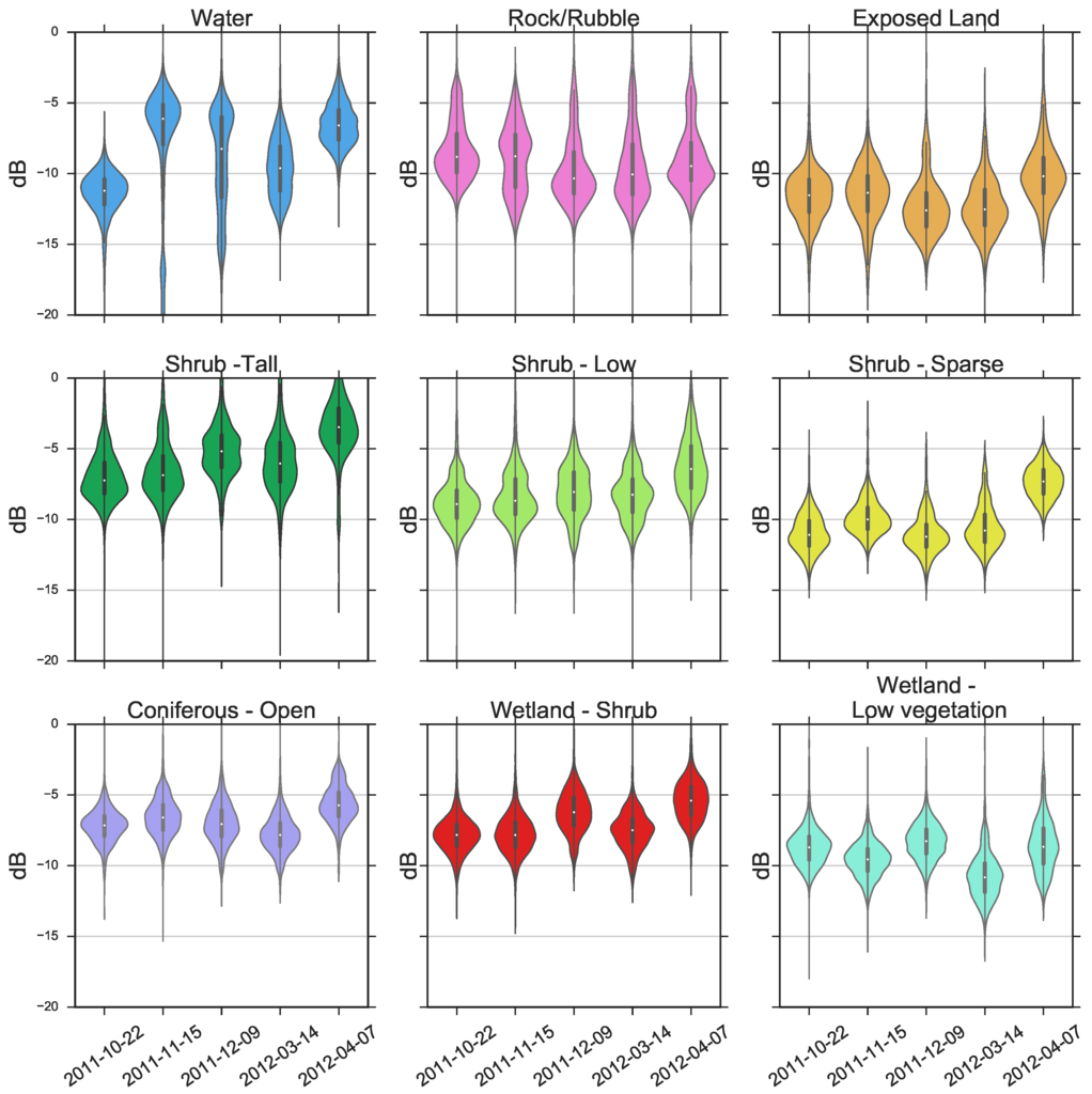 Similarly, by combining images acquired at different dates, in particular from different seasons, it is possible to enhance the separability between classes and to provide better classification accuracies [53]. For the studied environment, some classes will react differently to changes in temperatures during the transition from fall to winter. For example, the rock/rubble class will have very little variations in dielectric properties from fall to winter, while exposed land will experience a drop in its dielectric constant as the ground water freezes. Classes with shrub coverage tend to retain more snow, as demonstrated in [1,2,12], which causes ground temperatures to be warmer during the winter, enabling a better differentiation from classes with little or no shrub coverage. The volume scattering component from the vegetation is also affected by snow cover, as snow tends to attenuate the scattering from the vegetation due to the lower dielectric contrast between the shrub branches and the snow [26].