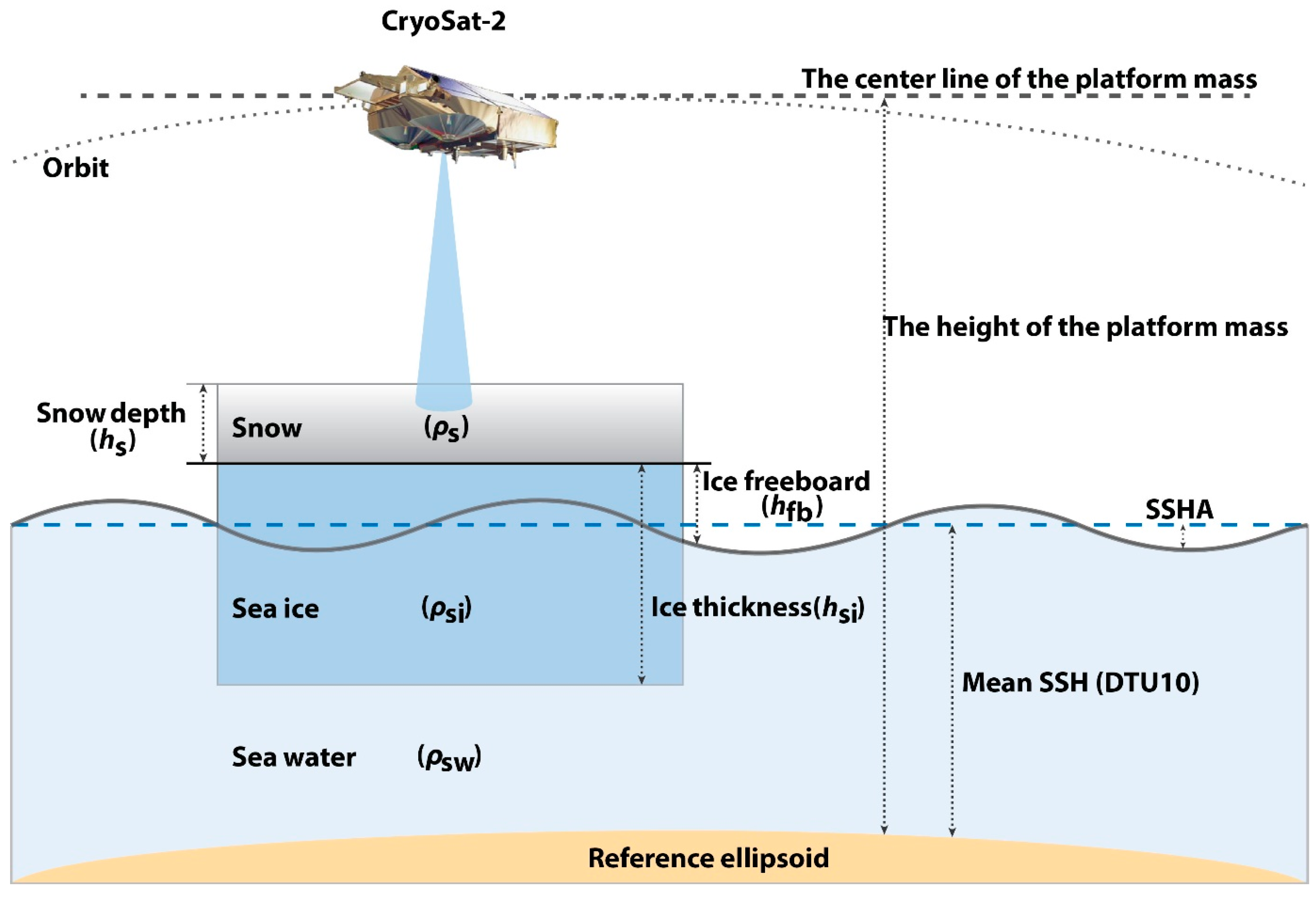 Estimation of the snow-covered Arctic sea ice thickness from CryoSat-2 measurements is based on the assumption of hydrostatic equilibrium [18] (Figure 1). If the sea ice freeboard () is accurately determined from altimeter measurements, the freeboard can be directly converted into sea ice thickness by Equation (1).