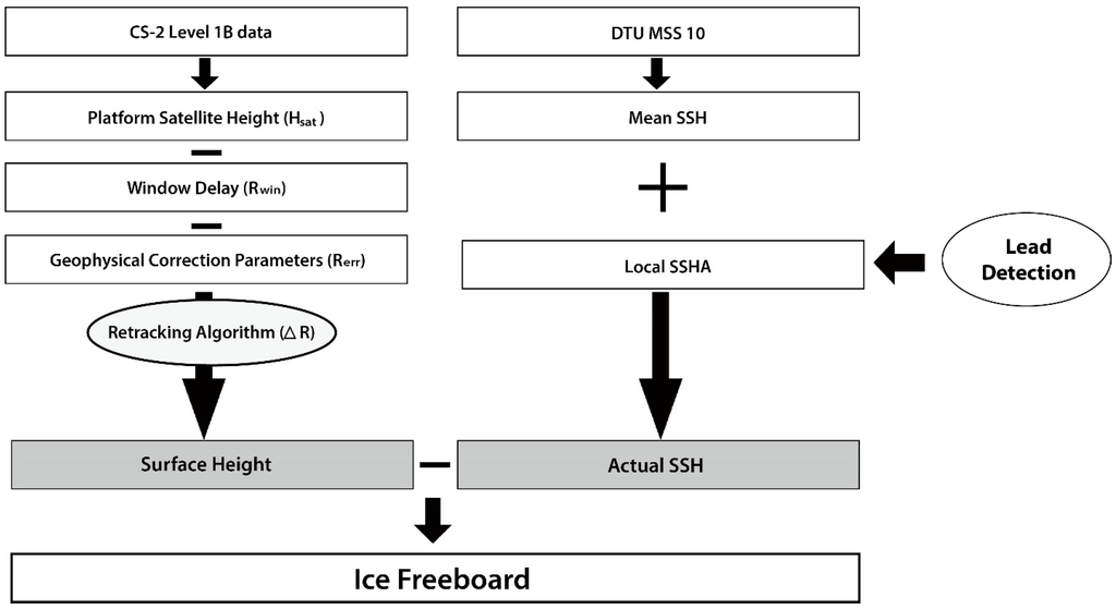 As mentioned above, it is important to determine the sea ice freeboard from CryoSat-2 data in order to successfully estimate the ice thickness. Figure 2 shows the procedure to determine the sea ice freeboard from CryoSat-2 L1B data. Initially, the surface height of the sea ice (i.e., the distance between the sea ice surface and the WGS84 ellipsoid) is estimated by Equation (2).