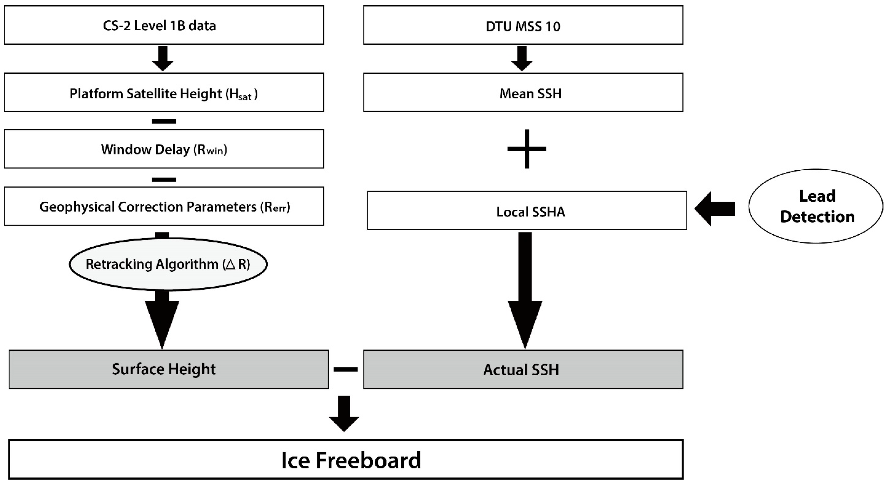 Schematic diagram of the freeboard and thickness processing from CryoSat-2. SSHA, Sea Surface Height Anomaly.