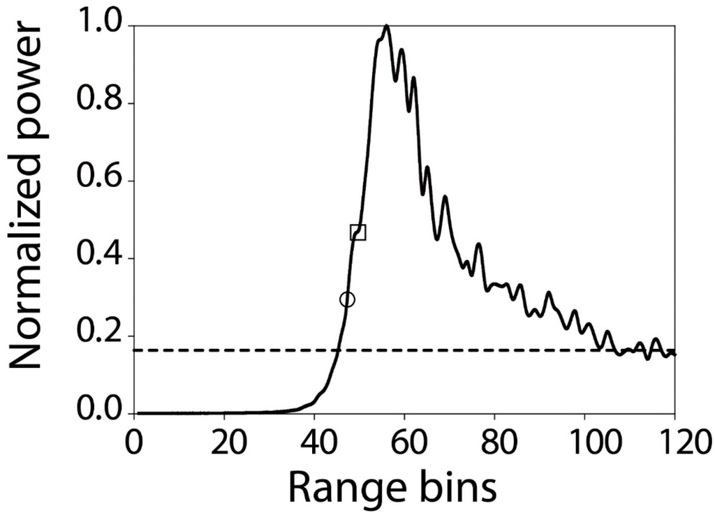 where is the retracking point and is an on-board retracking point. is a factor to convert from range bins to meters, which is 23.24 cm/bin for CryoSat-2. Figure 3 shows an example of the peak detection algorithm. This figure illustrates that the range point of the first maximum power (the open square) was found prior to the maximum power peak, and the retracking point (the open circle) was determined between the range point of the first maximum power and the threshold level (the dotted line). While various threshold values have been used in the literature, several studies have found that thresholds of 40% and 50% give the best result for determining the leading edge of the ice floe [16,40]. A threshold of 40% was used in the retracking method in this study as it was frequently used in the literature [16,19].