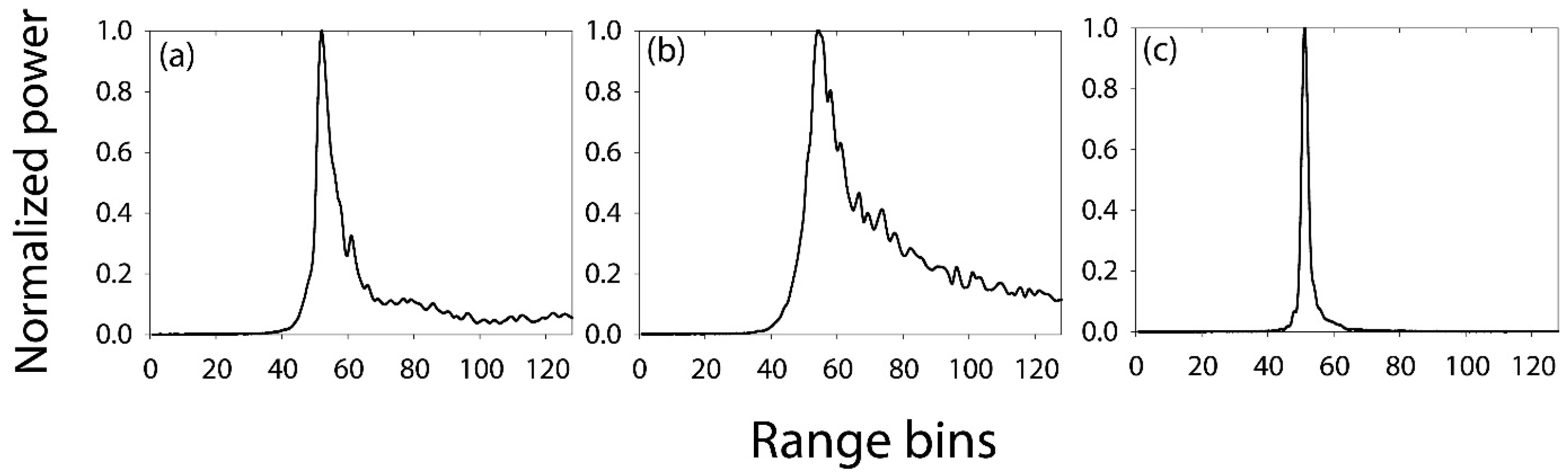 Typical normalized echo power waveform of CryoSat-2 SAR mode data over: (a) sea ice; (b) ocean; and (c) leads.