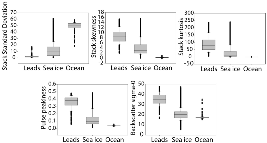 Box plots of five parameters (i.e., SSD, stack skewness, stack kurtosis, PP and backscatter sigma-0) over leads, sea ice and ocean using the March and April samples from 2011–2014. The vertical height of the boxes indicates the interquartile range of the samples. While a parallel line inside the boxes means a median value of the samples for each parameter, the dots represent the outliers.