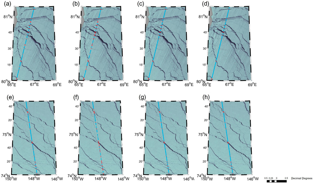 Examples of lead detection results around east Franz Josef Land on 11 April 2014 (a–d) and Beaufort Sea on 11 April 2011(e–h) using four methods: (a,e) Rose [16]; (b,f) Laxon et al. [18]; (c,g) See 5.0 in the present study and (d,h) random forest in the present study. Red and blue dots represent leads and sea ice, respectively.
