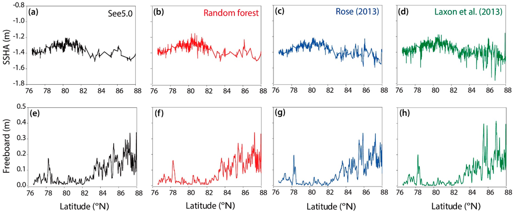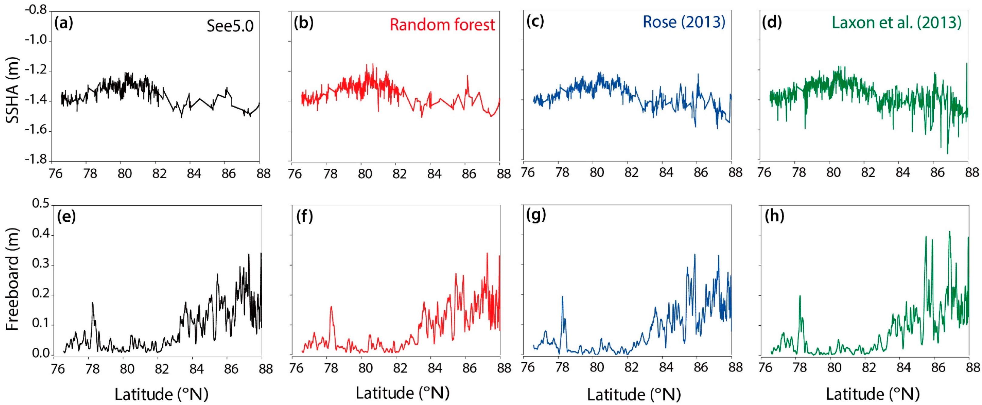Figure 8 shows the comparison of the SSHA and freeboard from the different lead detection methods. SSHA is a subtraction of LSSH from the mean SSH, representing the relative vertical location of leads. The proposed machine learning-based lead detection methods (Figure 8a,b) detected fewer leads than the existing methods (Figure 8c,d) with few leads above the latitude of 87°N, where leads are rarely found in April. Almost all of the leads detected by the proposed See 5.0 and random forest approaches were also detected by the approaches from Laxon et al. [18] and Rose [16]. SSHA was linearly interpolated and smoothed using a 3 × 3 (pixel) moving average filter. The freeboard, a derivation of surface height from the sum of SSHA and mean SSH, was smoothed by a 30 × 30 (pixel) moving average filter to remove signal noise. While the overall shape of the freeboard lines with latitudes looks similar, the average freeboards by approach—See 5.0, random forest, Rose [16] and Laxon et al. [18]—were 0.095 m, 0.092 m, 0.089 m and 0.090 m, respectively. The average freeboards of Rose [16] and Laxon et al. [18] were relatively underestimated compared to the freeboards by See 5.0 and random forest because of their over-identification of leads on the ice, especially over higher latitudes (>85°N; Figure 8c,d). Laxon et al. [18] found lower SSHA (Figure 8h) between 76°–80°N that appeared to be ocean. However, since the proposed machine learning-based lead detection approaches discriminate ocean from sea ice and leads, ocean was excluded in the SSHA.