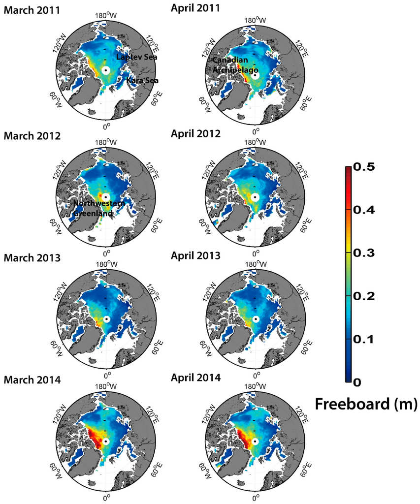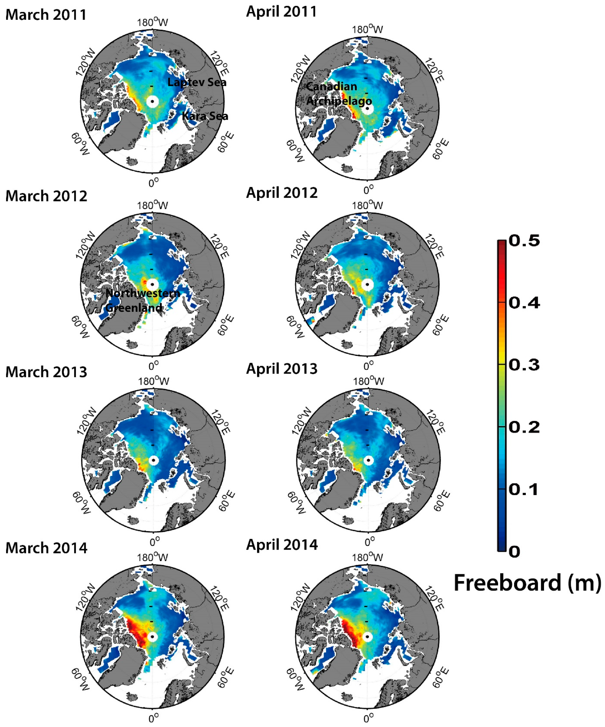 Arctic sea ice freeboard from CryoSat-2 for March and April between 2011 and 2014 based on the IC scheme. Non-sea ice areas were masked out using the EUMETSAT OSI SAF sea ice type data.