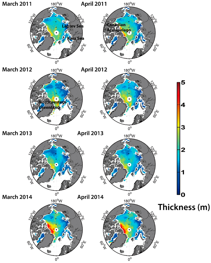 Arctic sea ice thickness from CryoSat-2 for March and April between 2011 and 2014 based on the IC scheme. Non-sea ice areas were masked out using the EUMETSAT Ocean & Sea Ice Satellite Application Facility (OSI SAF) sea ice type data.