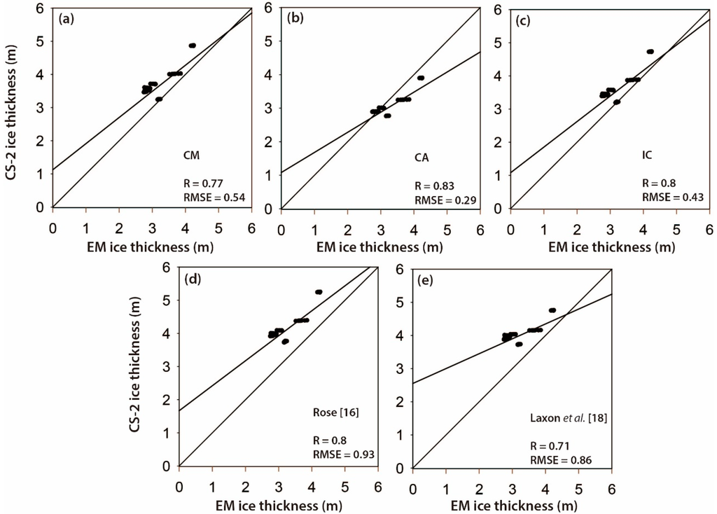 The monthly ice thickness that was averaged by grid using the novel machine learning-based lead detection approaches was compared to the averaged AEM-bird data collected 15 and 17 April 2011 during the CryoVex campaign, as well as the thickness derived by the lead detection methods from Rose [16] and Laxon et al. [18]. This comparison considered the three schemes and two lead detection methods (Figure 11). The sea ice thickness determined using See 5.0 with CA produced the best validation performance on both days with r ~ 0.83 and root mean square error (RMSE) ~0.29 m (Figure 11c).