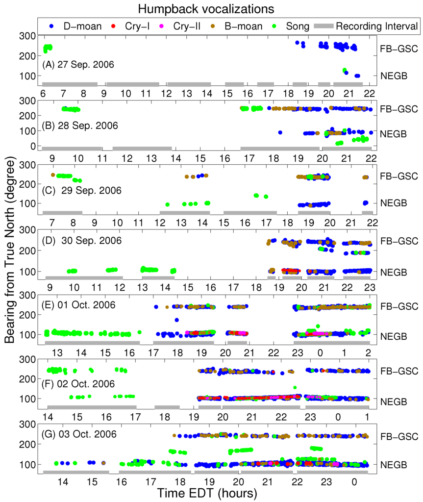 Humpback vocalization bearings measured by POAWRS receiver array in the Gulf of Maine on (A) 27 September 2006; (B) 28 September 2006; (C) 29 September 2006; (D) 30 September 2006; (E) 1 October 2006; (F) 2 October 2006 and (G) 3 October 2006. The bearings are measured from true North in clockwise direction with respect to the instantaneous spatial locations of the receiver array center. The vast majority of humpback vocalizations originate from two distinct bearing ranges: 90–130 degrees corresponding to Northeastern Georges Bank (NEGB) and 220–250 degrees extending from Franklin Basin to the Great South Channel (FB-GSC). The shaded bars on the x-axis indicate the operation time periods of the receiver array. The humpback whale vocalizations include songs, D-moans, B-moans, and cries of type-I and type-II.