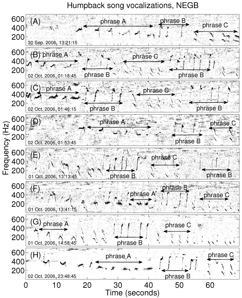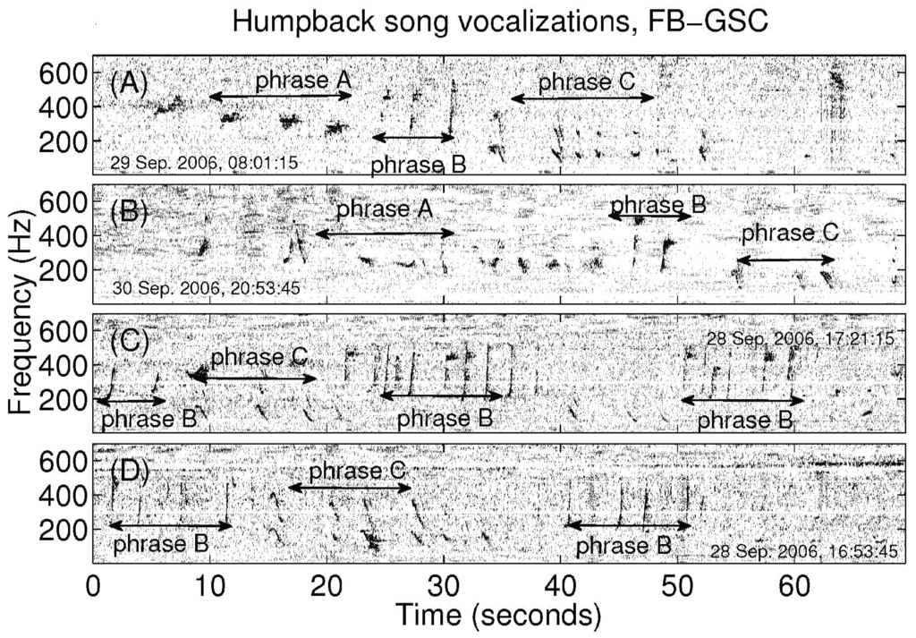 The song phrases shown in Figure 2 and Figure 3 here for humpbacks located at NEGB and FB-GSC respectively are similar to one or more phrases of humpback songs recorded previously in the Gulf of Maine and other ocean regions [5,7,8,19,21,55,56]. The song call rate of between 11 to 35 calls per minute obtained here is consistent with the call rates for humpback songs shown in spectrograms of Refs. [5,7,8,19,21,55,56].