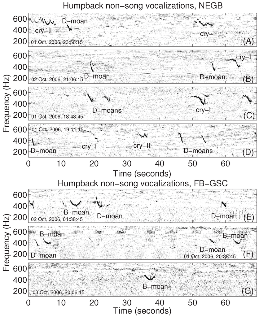 In addition to song vocalizations, humpbacks produce a wide variety of non-song vocalizations [1,2,21,22,23,24,25,26,27,28,29,30,57,57] that include social sounds, calls for coordinated movement during feeding and migration, as well as nighttime communication. The downsweep D-moans recorded here in the Gulf of Maine are similar in frequency band, duration and frequency-time slope to the “P.moan-moan” previously recorded in the vicinity of two humpback whales in Newfoundland Canada [22], (compare D-moans from Gulf of Maine humpbacks in Figure 6A,B with the P.moan-moan in Figure 1 of [57]). The bow-shaped B-moans (Figure 4E,F) recorded here in the Gulf of Maine with a downsweep followed by an upsweep are similar to other bow-shaped calls recorded from humpbacks in Antarctic coastal waters (compare with Figure 2A of [58]) and in Australian water (compare with Figure 2a of [59]).