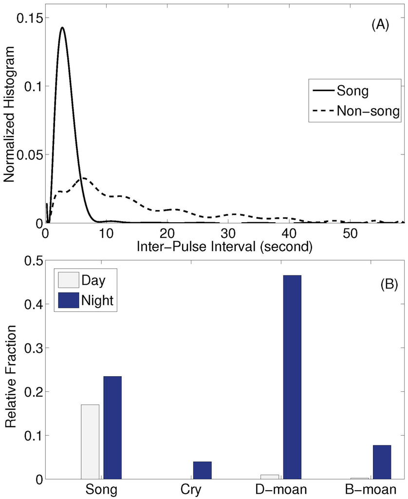 (A) Normalized histogram of inter-pulse intervals for humpback song and non-song vocalizations. The mean inter-pulse interval for songs is 3.5 s with standard deviation of 1.8 s. The mean inter-pulse interval for non-song vocalizations is 14.2 s with standard deviation of 11 s; (B) Percentage occurrence of humpback song and non-song D-moan, B-moan and cry vocalizations. Songs were detected roughly 40% during the day and 60% during the night. The humpback non-song vocalizations were detected at night with negligibly small detections during the day.