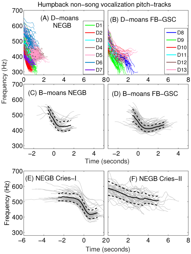 Ensemble of pitch-tracks extracted from received humpback vocalizations for (A) NEGB D-moans; (B) FB-GSC D-moans; (C) NEGB B-moans; (D) FB-GSC B-moans; (E) NEGB cries-I and (F) NEGB cries-II. The thick solid and dotted curves are the mean and standard deviation of each ensemble of pitch-tracks shown. The pitch-tracks for the D-moans and cries-II are aligned in time based on the start time. The pitch-tracks for the B-moans and cries-I are aligned in time based on their maximum gradients. The pitch-tracks for the D-moans are color-coded based on the clustering result for NEGB (7 sub-types) and FB-GSC (6 sub-types) (see Appendix).