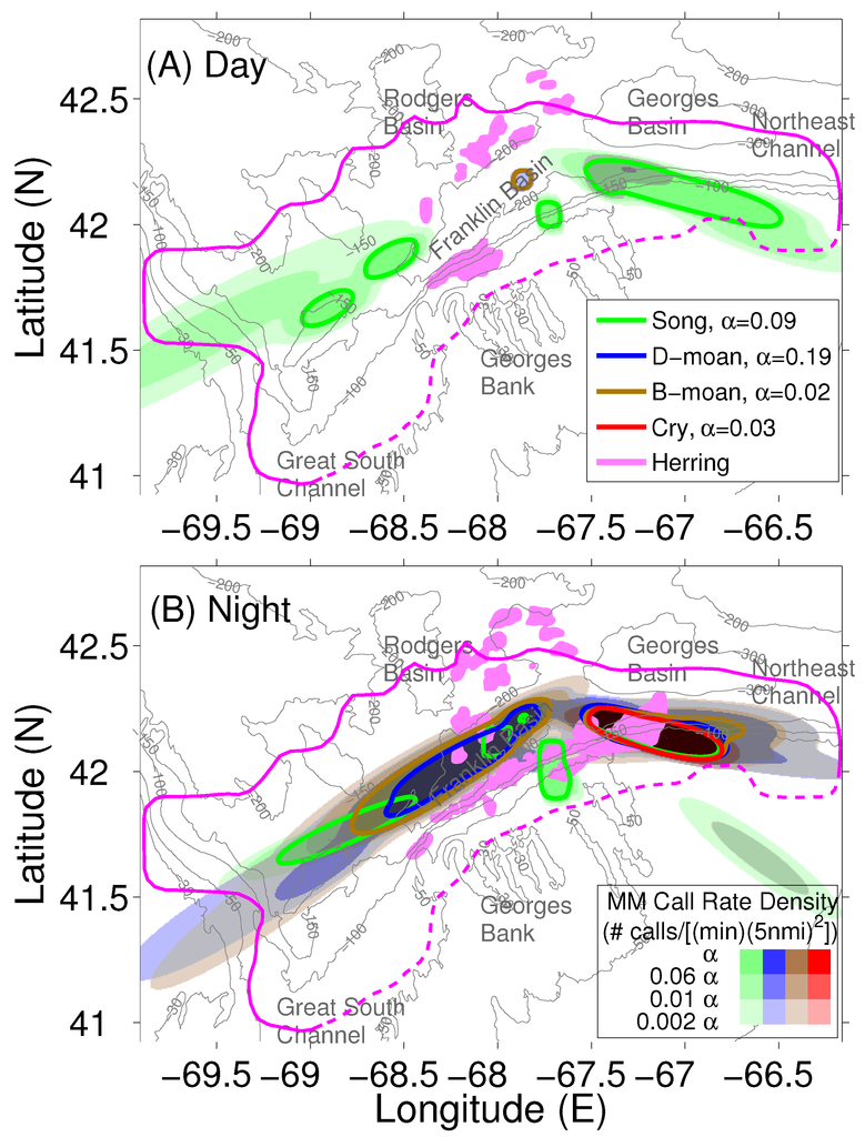 The call rate spatial distributions for humpback song and non-song D-moan, B-moan and cry vocalizations averaged over 27 September to 3 October 2006 are shown in Figure 7A,B for day and night time periods respectively. Song vocalizations occur during both day and night, originating from areas on NEGB, northcentral Georges Bank, and FB-GSC. The day and night time humpback song vocalizations are both well contained (>95%) within the region of diffuse herring (∼0.053 fish/m). The daytime humpback song vocalizations have no overlap with daytime dense herring shoals (>0.2 fish/m). The nighttime humpback song vocalizations have substantial overlap with nighttime dense herring shoals (>0.2 fish/m) on NEGB, but less significant overlap on FB-GSC. The non-song D-moan, B-moan and cry vocalizations occur at night with negligible or no occurrence during the day. Non-song D-moan and B-moan vocalizations originate from areas on both NEGB and FB-GSC at night. These vocalizations have substantial overlap with nighttime dense herring shoals (>0.2 fish/m) on NEGB, and have less overlap on FB-GSC. The humpback non-song cry vocalizations originate exclusively from NEGB at night (Figure 7B) where they overlap with dense herring shoals.