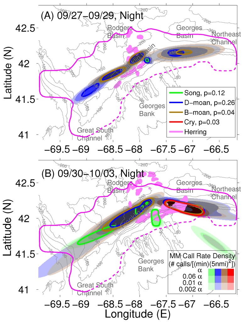Nighttime spatial distributions of call rates for different humpback vocalization types and Atlantic herring population. The data are averaged over nighttime hours for (A) from 27–29 September 2006 and (B) from 30 September to 3 October 2006. All other contours are similar to Figure 7.