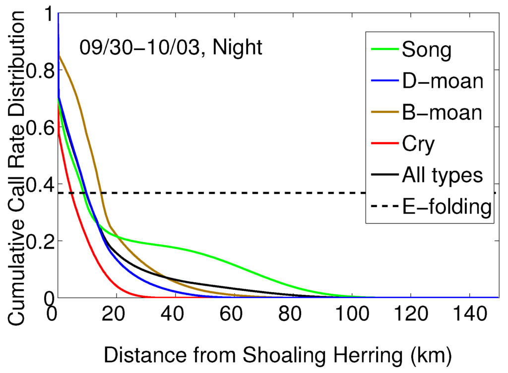 The humpback cumulative call rate spatial distributions for different vocalization types in Figure 9 are plotted as functions of decreasing distance from shoaling herring and so take the value 0 at long ranges from herring shoaling locations and monotonically increase to 1 at herring shoaling locations. The e-folding decay range of the cumulative call rate distribution for each humpback call type is the distance from herring shoals where the cumulative call rate distribution decays to 1/e = 0.37, so that 63% of vocalizations of each type are contained within the e-folding decay range.