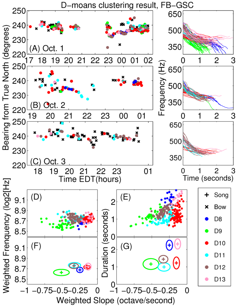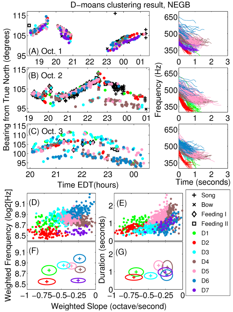 Clustering of NEGB D-moans from 1–3 October identified 7 distinct sub-types. (A–C) Bearing-time trajectories of humpback vocalizations with D-moans color-coded based on sub-type clustering. Corresponding D-moan pitch-tracks are indicated for each day; (D) The ensemble of amplitude weighted slope and frequency features; (E) The ensemble of amplitude weighted slope and duration features; (F) The mean and one standard deviation of amplitude weighted slope and frequency features; (G) The mean and one standard deviation of amplitude weighted slope and duration features for each D-moan sub-type cluster. The D-moan sub-type D7 is present on 1 October, but absent on 2 and 3 October.