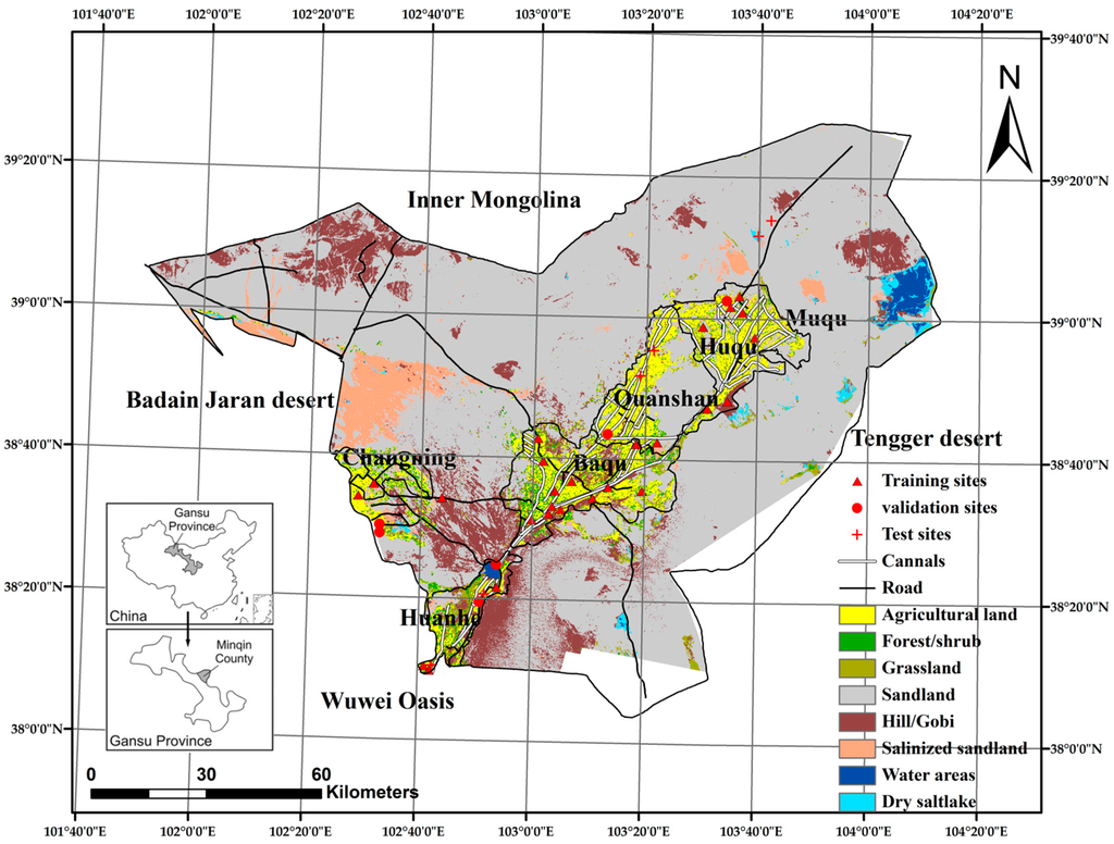 The temperate-arid dryland system of Minqin County is a 2000-year-old desert oasis located in the northeastern region of the Hexi Corridor, on the lower reaches of the Shiyang River in Gansu Province, Northwest China (38°03′N to 39°28′N, 101°49′E to 104°12′E, Figure 1). As an inland dryland system at the bottom of the inland Shiyang River, playas have developed (i.e., dry salt lake indicated in Figure 1), at local depressions or in foot areas of local residual hills (i.e., salinized sandland in Figure 1). Excessive and unreasonable irrigation with low-quality groundwater is the major cause of secondary sodification and salinization in the oasis [29,30].