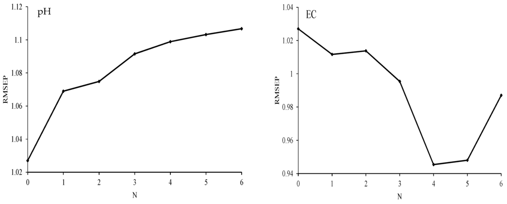 In this study, the PLSR modeling was performed using SAS 9.2 software. One-at-a-time cross-validation was used to test the predictive performance of the models with different extracted factors, and the model with the minimum root mean square predicted residual error (RMSEP) was chosen as the calibration model (SAS/STAT(R) 2010). A multiple-layer, feed-forward back-propagation network was used, including input, hidden, and output layers. This type of network generally provides better performance in comparison to other network types [43], and is the most popular neural network structure in ecological modeling and soil science [44,45]. Using a tan-sigmoid function in the hidden layer allows us to approximate nonlinear relations between input and output layers [46]. The range of the appropriate number of neurons in a hidden layer is from (2n1/2 + m) to (2n + 1), where m refers to the number of output nodes and n to the number of input nodes [47]. Within the range, the number of neurons in the hidden layer was systematically changed during the process of training the networks, and the most appropriate neurons were selected based on the resulting performance.