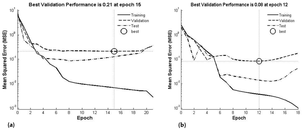 Mean squared error (MSE) curve of (a) pH and (b) EC optimal ANN model at the phase of learning for training, validation, and test datasets, respectively.