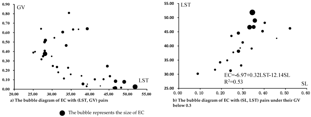 The bubble diagram of EC with the related EMs and LST. (a) The bubble diagram of EC with (LST, GV) pairs; (b) The bubble diagram of EC with (SL, LST) pairs under their GV below 0.3.