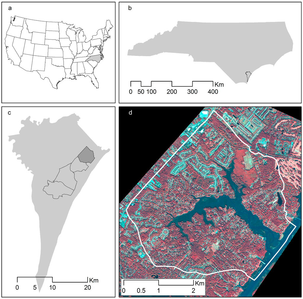 The study area is located in (a) the Southeastern United States; (b) in the coastal southeast in the state of North Carolina; (c) in New Hanover County; and (d) Pages Creek is one of six tidal creek watersheds in the county.