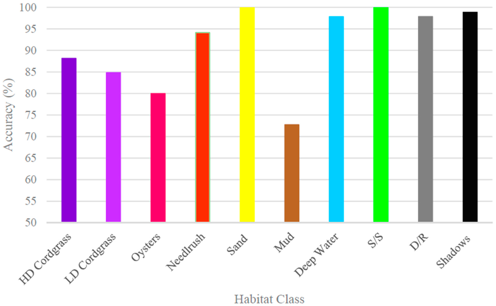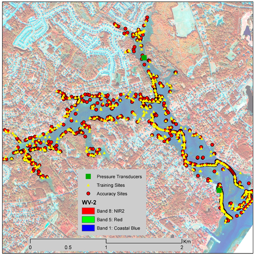 Of the nine habitats mapped in this study, oysters and mud had the lowest map accuracy, which was primarily due to being submerged during the time of the image acquisition (tide level was 1.146 m. above MLLW). Usually, it is most desirable to generate maps at low tide; however, it is rare to be able to obtain satellite imagery at ideal times and clear weather. Therefore, the success of the WV-2 imagery to map submerged habitats was one of the main goals of the study. Additionally, ideally the field work should be conducted as close to the date of the remotely-sensed imagery in order to minimize variability as habitats change through time. The extensive field sampling effort enabled high accuracy habitat mapping. Without this large field effort there would probably not be the high level of map accuracy.