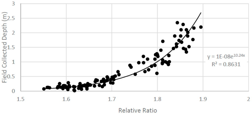 Relative bathymetry ratio (x-axis) versus measured depth (y-axis). This equation was used to calculate bathymetry for all of the sand and water areas.