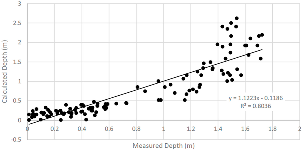Measured versus calculated water depth (R2 = 0.80).