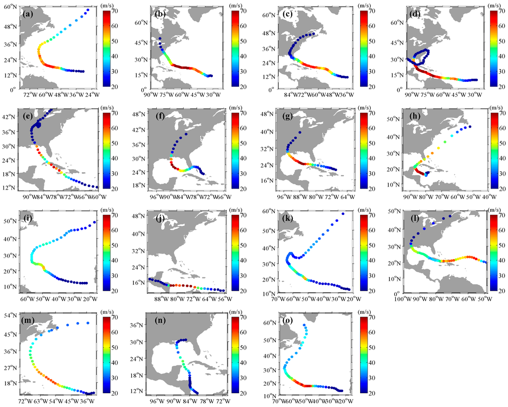 Best track positions and the corresponding intensity of the selected hurricanes for (a) Fabian, 27 August–9 September 2003; (b) Isabel, 6–19 September 2003; (c) Frances, 25 August–9 September, 2004; (d) Ivan, 2–24 September 2004; (e) Dennis, 4–17 July 2005; (f) Katrina, 23-30 August 2005; (g) Rita, 18–26 September 2005; (h) Wilma, 15–26 October 2005; (i) Helene, 12-26 September 2006; (j) Felix, 31 August–6 September 2007; (k) Bertha, 3–21 July 2008; (l) Ike, 1–15 September 2008; (m) Bill, 15–25 August 2009; (n) Ida, 4–11 November 2009; and (o) Igor, 8–22 September 2010.