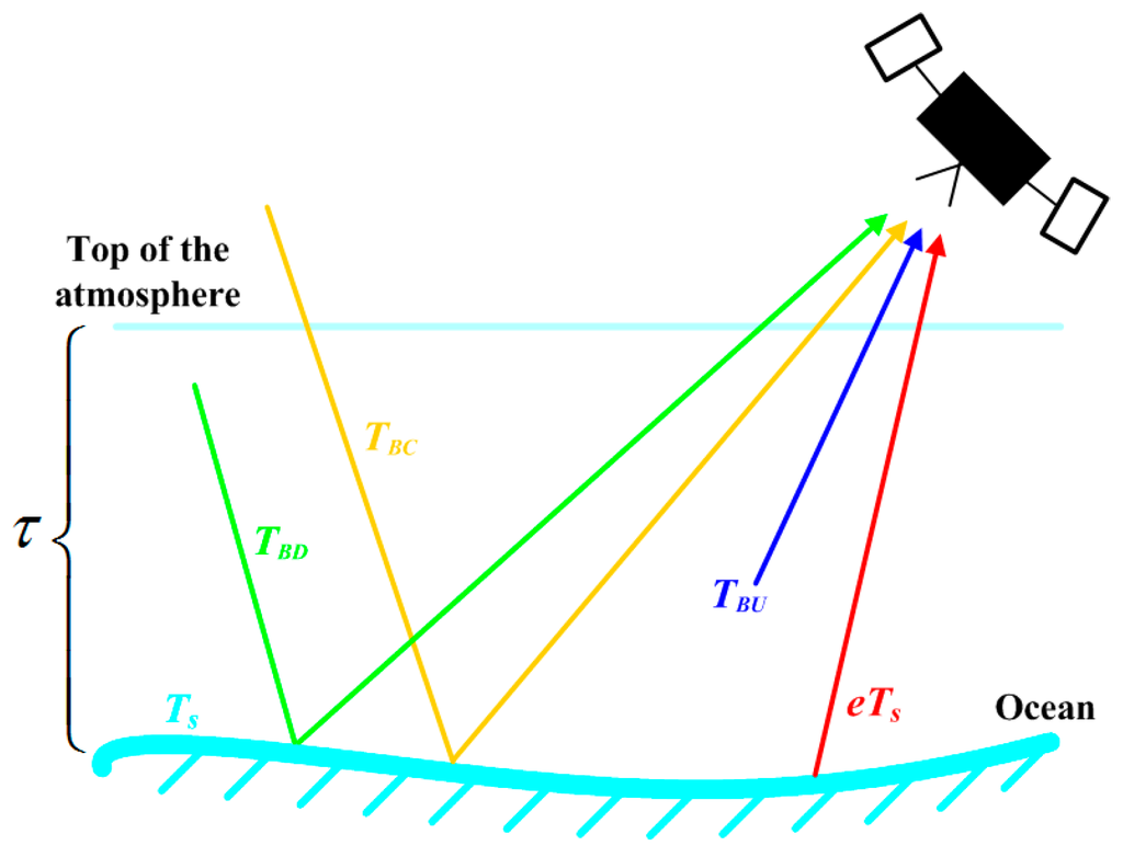 where ep refers to the ocean surface emissivity at polarization p (p = v, h), and the corresponding ocean surface reflectivity is rp = 1 − ep. TS is the sea surface temperature, and is the transmissivity of the atmosphere. The (p = v, h) term is a correction factor to account for nonspecular reflection of the TBD from the rough ocean surface [38]. Figure 2 describes the brightness temperatures received by a radiometer.