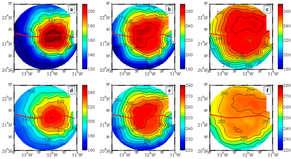 Brightness temperatures measured by WindSat orbit #3510 on 10 September 2003, over hurricane Isabel (a) at 10.7 GHz, horizontal polarization; (b) at 18.7 GHz, horizontal polarization; (c) at 37.0 GHz, horizontal polarization; (d) at 10.7 GHz, vertical polarization; (e) at 18.7 GHz, vertical polarization and (f) at 37.0 GHz, vertical polarization. The red curve denotes the best track, which was obtained from the NHC.