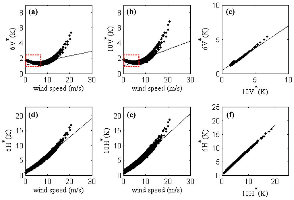 Figure 4a,b illustrate the relationships between 6(10)V* and ECMWF wind speed. The 6(10)V* decreases initially because the shielding effect has been found in the calculation of ocean emissivity at V-polarization and then increases with increasing wind speed. The sensitivity of 6(10)V* to wind speed is approximately 0.37(0.5) K/(m/s) when the wind speed is from 8 to 20 m/s. Figure 4d,e show the relationships between 6(10)H* and ECMWF wind speed. The 6(10)H* increases with increasing wind speed, which is different from 6(10)V*. The sensitivity of 6(10)H* to wind speed is better than that of 6(10)V*, and it is approximately 0.85(0.93) K/(m/s). The previous study [15] showed that the sensitivity of 6H* to wind speed is approximately 1 K/(m/s), which is higher than our calculated result. The diverse data resources may result in this difference. On the contrary, our calculated result of 6H* is higher than the experimental result [49], which indicates that the sensitivity at approximately 6–7H is approximately 0.5 K/(m/s), even though the experiments are limited to ground-based observations. Figure 4c illustrate the relationships between the 6V* and 10V*. When the wind speed is from 0 to 20 m/s, the ratio of 6V* to 10V* is a constant which is approximately 0.82. The ratio of 6H* and 10H* has similar characteristics (Figure 4f), and the value is approximately 0.92. These results are in good agreement with the previous results [15,28].