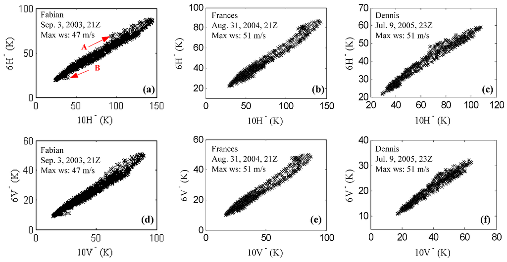 Figure 6 shows the brightness temperatures of 6H¯ (V¯) and 10H¯ (V¯) inside and around hurricanes. The cases in which the center of the hurricane contains land areas were removed because 6H¯ (V¯) and 10H¯ (V¯) cannot be evaluated over land. Figure 6a shows the WindSat 6H¯ and 10H¯ from hurricane Fabian on 3 September 2003, and the maximum wind speed is 47 m/s. Figure 6b displays the WindSat 6H¯ and 10H¯ on 31 August 2004, with a maximum wind speed of 51 m/s for hurricane Frances. Figure 6c presents the WindSat 6H¯ and 10H¯ on 9 July 2005, with a maximum wind speed of 51 m/s for hurricane Dennis; Figure 6d–f illustrate the results of the vertically polarized channels. In Figure 6a, the data marked by arrow A correspond to the outer area around Fabian, and the data marked by B correspond to the area inside Fabian. The situation is similar for the other cases. In addition, the arrow B moves upward as the wind speed increases, and the above results are in good agreement with the previous study [15].
