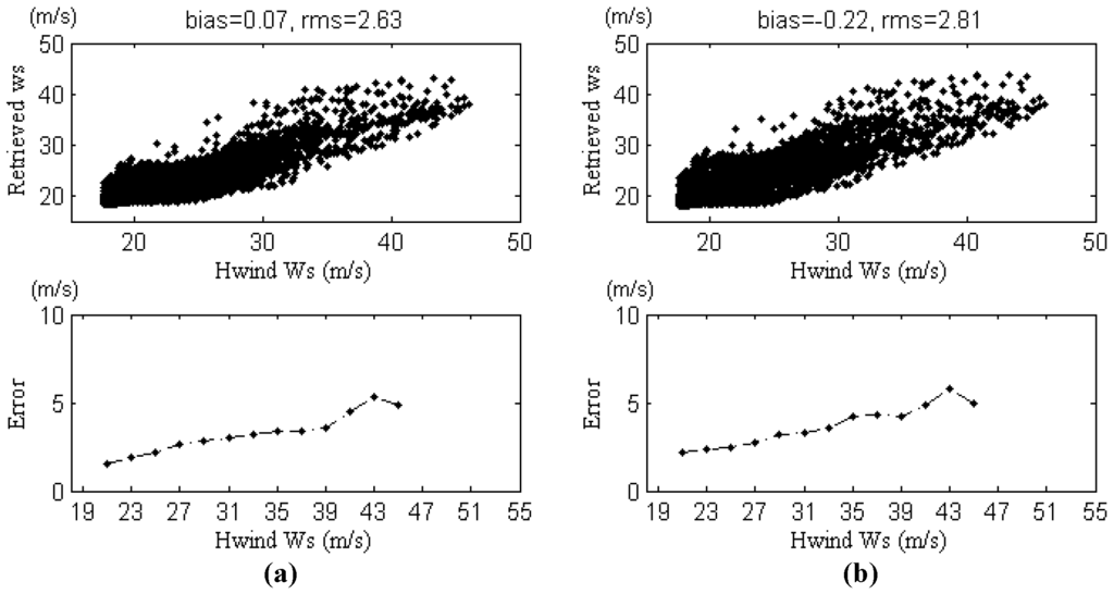 As a case study (denoted as Rita-1), two different models are used to retrieve wind speed using the WindSat TBs for hurricane Rita on 22 September 2005, at 1330 UTC. Figure 10a presents the H*wind analysis wind speed, and Figure 10b shows the retrieved wind speed using our new model. Figure 10c shows the retrieved wind speed using the RSS global algorithm, and Figure 10d illustrates the corresponding RSS rain rate. Figure 10e shows the difference between the retrieved wind speed and the H*wind analysis data. The difference between the RSS wind speed and the H*wind analysis data is presented in Figure 10f. In addition, the corresponding W6H and W6V are presented in Figure 10g,h, respectively. In this case, the H*wind analysis wind speed is obtained for 22 September 2005, at 1330 UTC. At that time, the center of typhoon’s eye was located at 25.197°N and −88.531°E. However, the center of typhoon’s eye was located at 25.141°N and −88.237°E at the time of the WindSat observation, which is obtained from the NHC. Therefore, we shifted the H*wind analysis wind speed so that the eye of the H*wind analysis coincides with eye of the WindSat measurement. Comparing W6H with W6V, we find that W6H seems to have a better correlation than W6V. The distribution of W6H is similar to that of wind speed. The performance of the new model is satisfied, and the distribution of retrieved wind speed is very close to the H*wind analysis wind speed, with the mean bias of 0.79 m/s and RMS difference of 1.79 m/s. As for RSS wind speeds, the influence of rain is obvious. On the contrary, our new model can reduce the influence of rain to some extent, and the retrieved results (Figure 10e) are in good agreement with the H*wind analysis wind speed. In general, the RSS global wind speed underestimates the wind speed in most regions, and the retrieved results are vulnerable to rain (Figure 10f). In addition, it is seen that the retrieved wind speed overestimates wind speed in the center of the eye for our retrieved results and RSS wind speeds. This may be because there are still strong waves that increase the emission from ocean surface, even though the wind speed is relatively low in the eye of the typhoon.