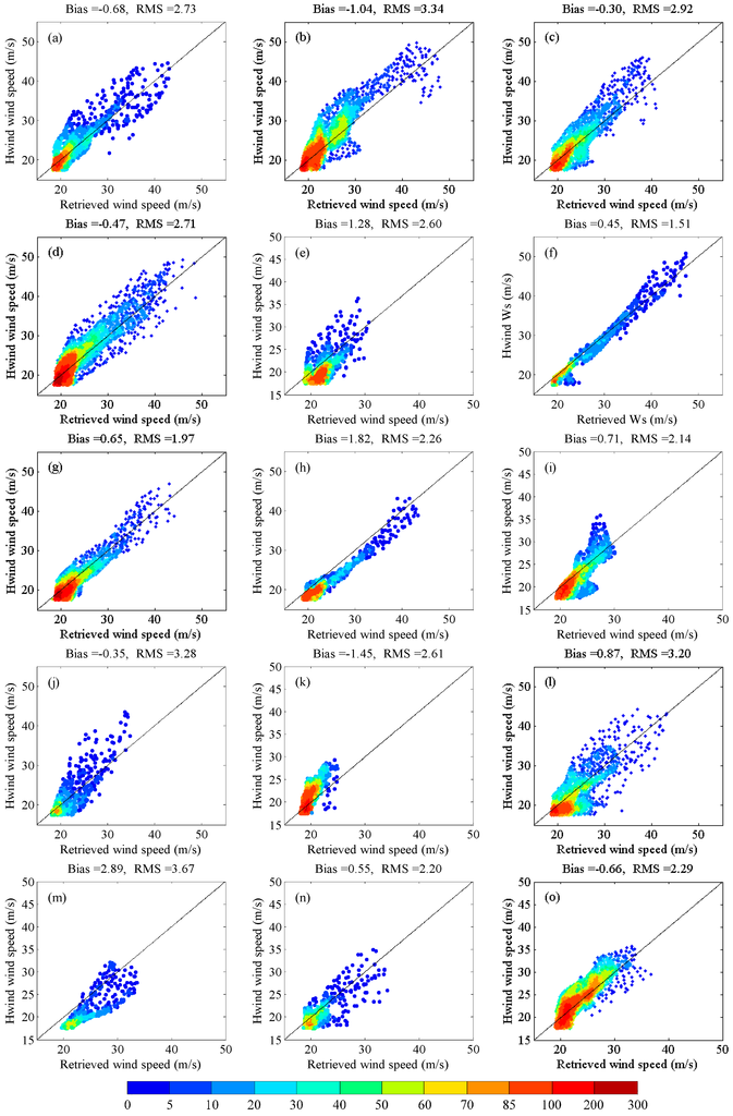 Figure 8 presents the retrieved wind speed using the new model versus the corresponding H*wind analysis data for each selected hurricane. The mean bias and RMS error are given in the top of each single panel. For wind speeds above 20 m/s, the mean bias and overall RMS difference of the new model are 0.04 m/s and 2.75 m/s, respectively, for 15 hurricanes from 2003 to 2010. Positive biases are found in some hurricanes, including Dennis, Katrina, Rita, Wilma, Helene, Ike, Bill, and Ida. For hurricane Bill, in particular, the new model largely overestimates wind speeds, with a mean bias of 2.89 m/s. On the contrary, the largest negative bias (−1.45 m/s) is found in hurricane Bertha. On the whole, the retrieved results have a good agreement with the H*wind analysis wind speed.