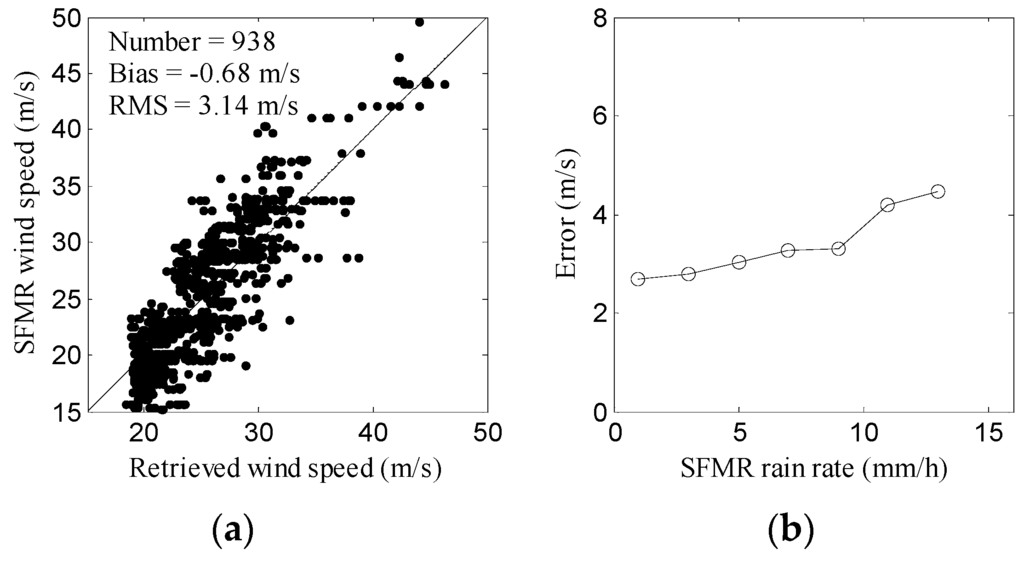 Validation of hurricane surface wind fields is inherently challenging because there is no realizable “surface truth” data. Fortunately, a relatively reliable and reasonable estimation of tropical cyclone (TC) wind fields has been developed through the H*wind analysis system. The wind fields produced by this system have been extensively used to study the wind speed retrieval algorithms under severe weather conditions [10,11,15,21,22,23,24]. H*wind is a software tool that provides an objective analysis of the 1-min sustained-wind field at a height of 10 m above the sea surface and was developed by the Hurricane Research Division (HRD) of the Atlantic Oceanographic and Meteorological Laboratory [25]. The H*wind analysis system assimilates all available surface observations, such as buoys, ships, C-MAN platforms, and surface airways, and all available aircraft and remote sensing data sources, which typically includes the SFMR, QuikSCAT, SSM/I, Geostationary Operational Environmental Satellite (GOES) low-level cloud drift winds, and Global Positioning System (GPS) dropwindsondes from aircraft. Typical wind speed errors in an H*wind analysis are estimated to be 10% to 20% [26]. The wind speed errors in this analysis will vary depending on the quantity and quality of data that are available, as well as on the degree of quality control employed by the analyst. Although each wind speed analysis produced by this system may be inaccurate, the ensemble average over a large number of collocations can minimize the error in the overall analysis.